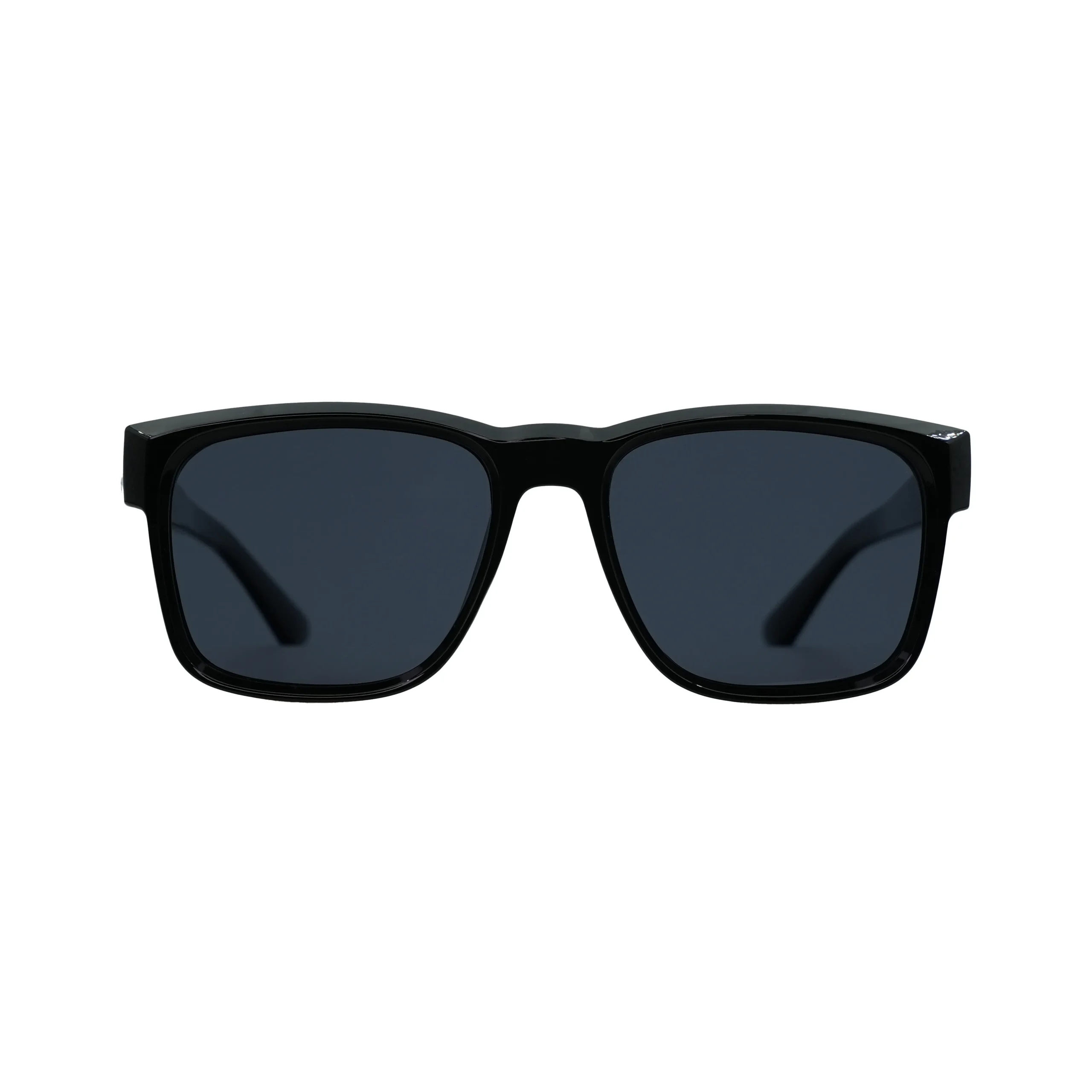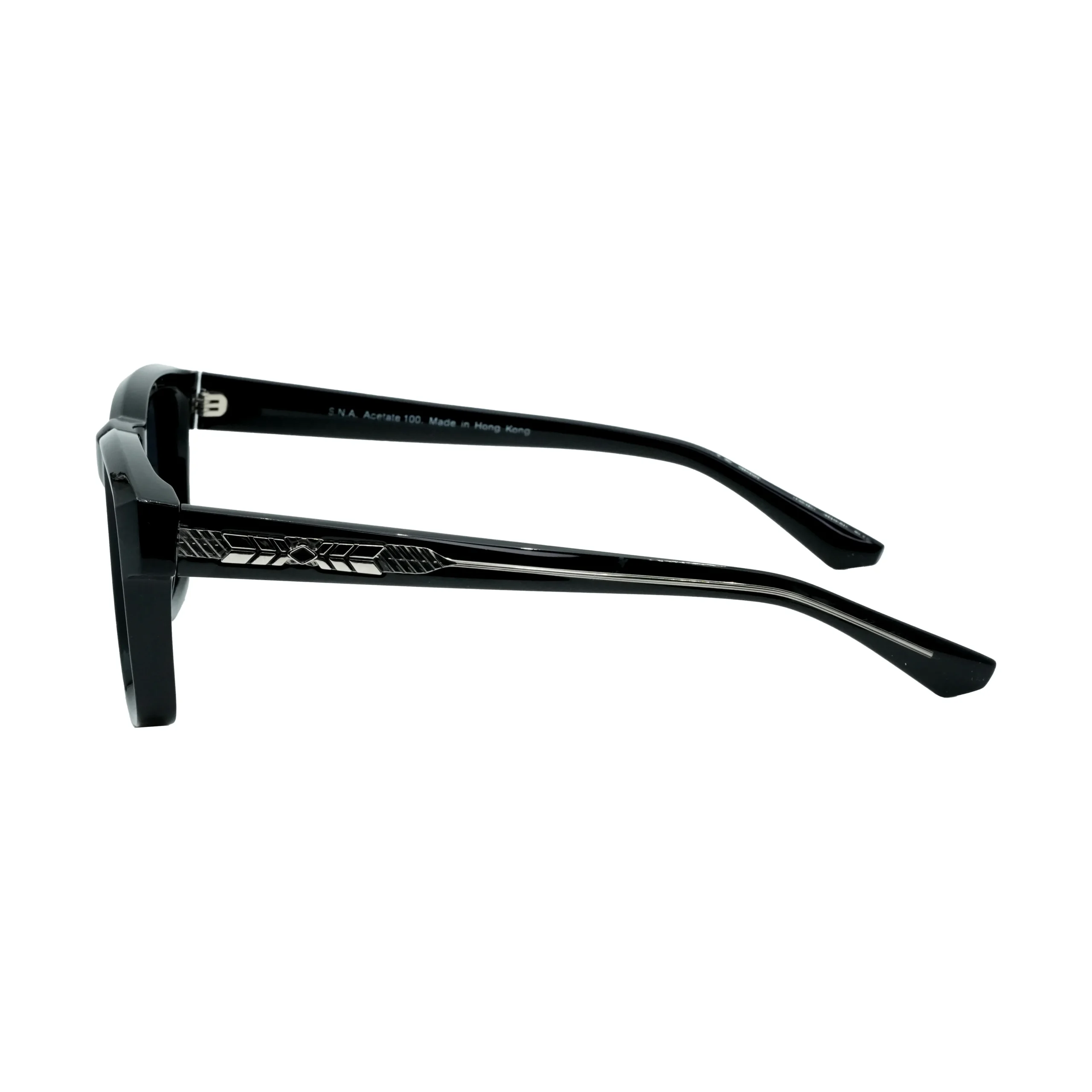 این عینک با فریم مشکی براق و عدسیهای آبی خاکستری تیره، حس اقتدار، مینیمالیسم و جذابیت بیزمان را القا میکند.