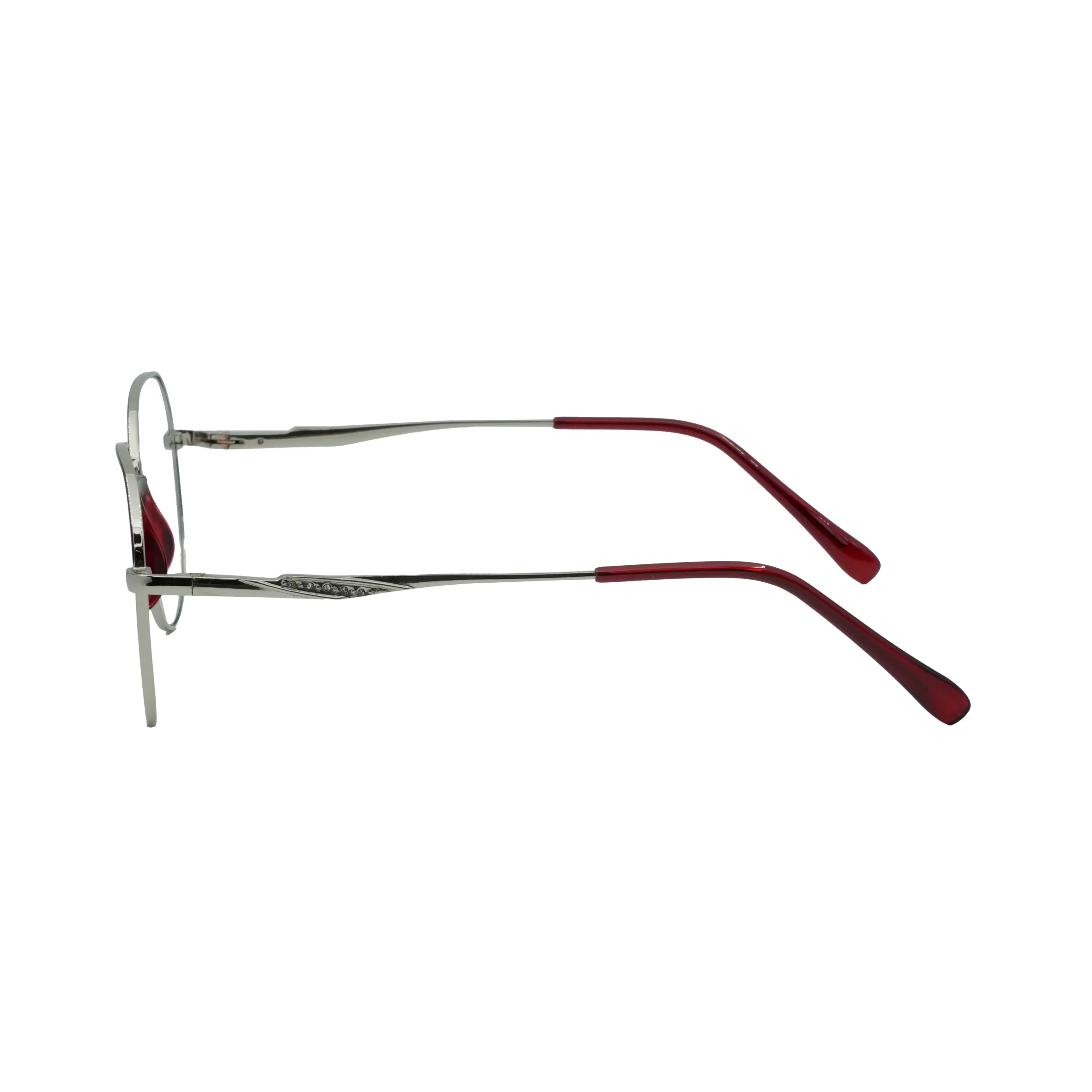 این عینک با ترکیب فلز نقره‌ای و جزئیات قرمز شفاف در بخش‌های داخلی، ظاهری حرفه‌ای و شیک به خود گرفته است. فرم گرد نزدیک به بیضی و طراحی نیمه کلاسیک آن، حال‌و‌هوای هوشمندانه‌ای دارد که برای استایل‌های شهری، کاری یا حتی آکادمیک بسیار مناسب است. دسته‌های باریک فلزی با تزئینات ظریف و سری قرمز رنگ، باعث افزایش جذابیت و در عین حال سبکی فوق‌العاده این مدل شده‌اند. این عینک انتخابی بی‌نقص برای افرادی‌ست که به دنبال ترکیبی از وقار مینیمالیستی و شخصیت جدی هستند.